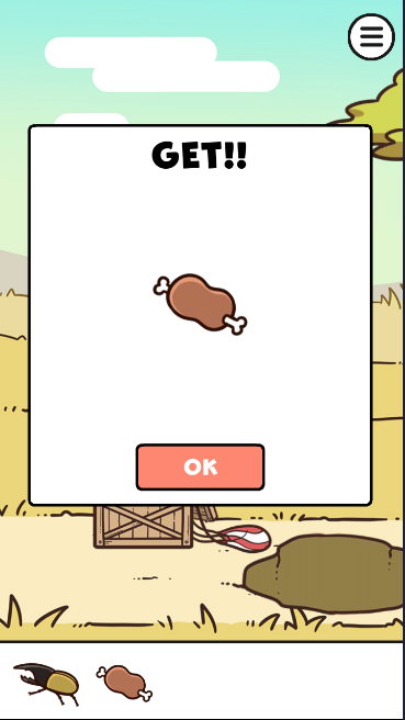 つるはしで木箱を開けて肉を入手してクリア。