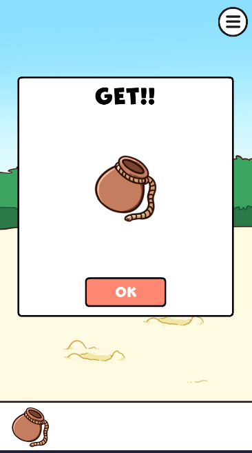攻略・答え 土を掘って縄を入手する。 右に移動し、壺を入手する。 左に移動し、海に壺をつかう。虫眼鏡を入手する。更に海に壺を使ってタコを入手する。 一番右に移動し、太陽に虫眼鏡を使って火を起こす。タコを焼いてクリア。