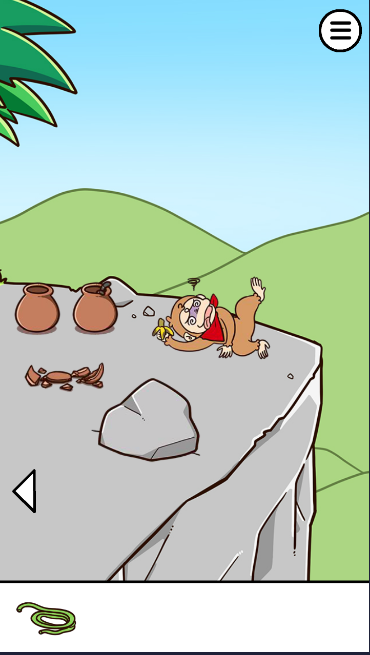 攻略・答え 上にあるツルをタップし、ロープを入手する。 一番右に移動し、壺を割ってバナナを入手し、バナナを猿に使って赤いマントを入手する。 石に赤いマントを使うと、石が吹っ飛ぶ。 左に移動し、斧を入手する。斧で木を切る。更に左に移動し、斧で木を切るとイカダが出来る。一番右に移動し、石のあった場所にイカダを置いてタップするとクリア。