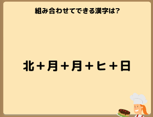 6.どんなネタ? 【答え】いくら 7.ここはどこ? 【答え】青森 8.なんの動物? 【答え】トナカイ 9.なんと読む? 【答え】合言葉 10.組み合わせてできる漢字は? 【答え】背脂 最終問題 【答え】クリスマスパーティー